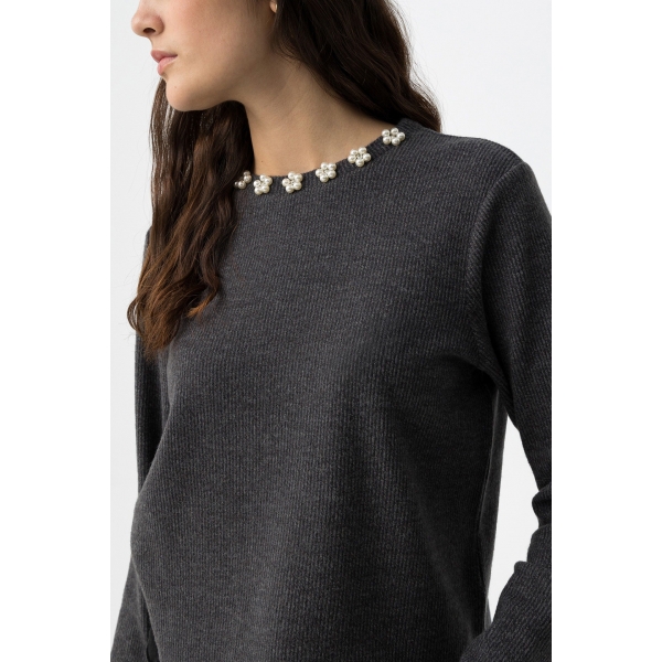 Jersey de punto acanalado con cuello alto. Detalle de aplicaciones florales con perlas en escote y abertura trasera con botón (Foto).