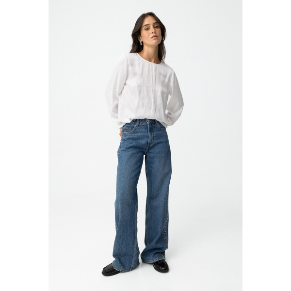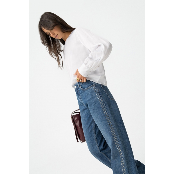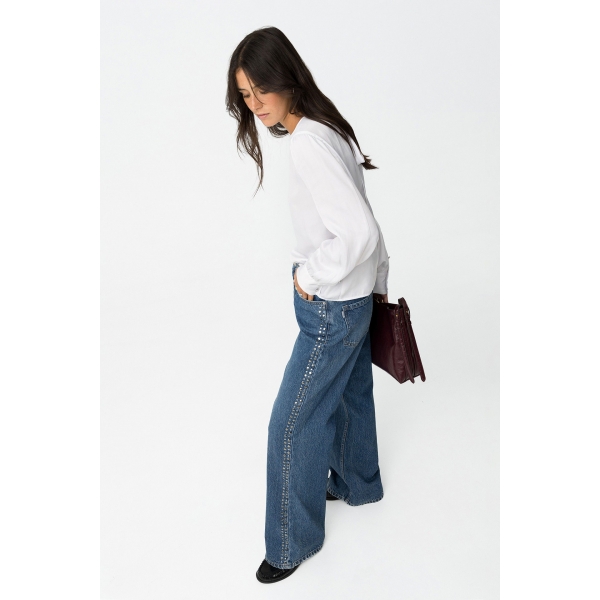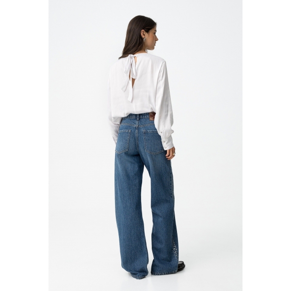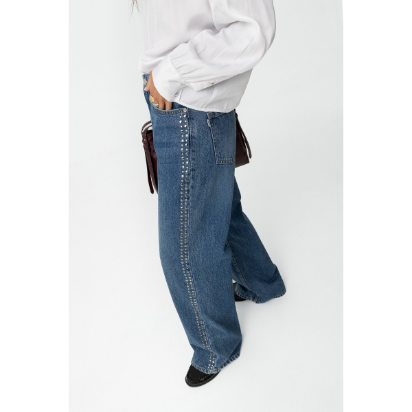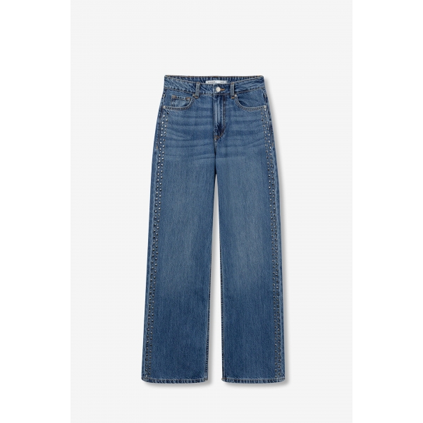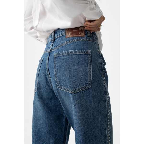 Jeans de pierna ancha con aplicaciones metálicas, cintura alta y cinco bolsillos. Cierre frontal con cremallera y botón metálico (Foto).