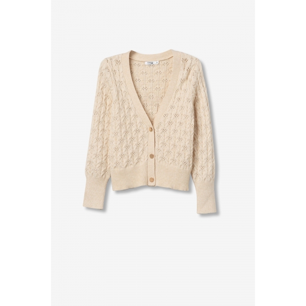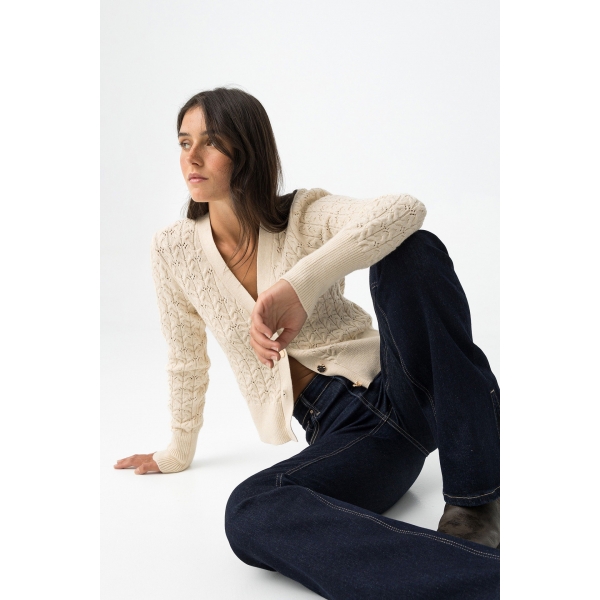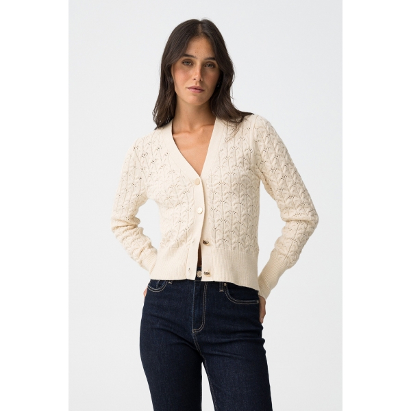 Cárdigan de punto con estampado de encaje, manga larga con puños y cinturilla en acabado canelado. Escote en V y cierre frontal con botones de contraste. Textura decorativa en relieve (Fotos).