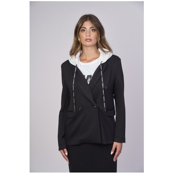 Chaqueta cruzada negra con capucha, prenda versátil que combina la elegancia clásica con un toque de modernidad, su corte entallado y cierre de botones en contraste, ofrece una silueta sofisticada y estructurada (Fotos).