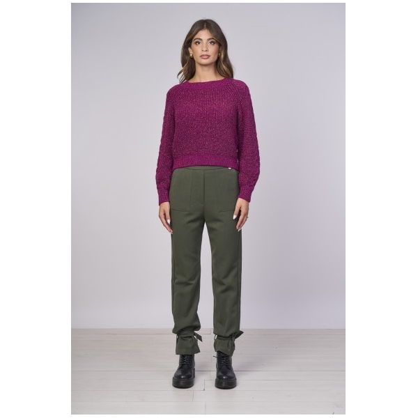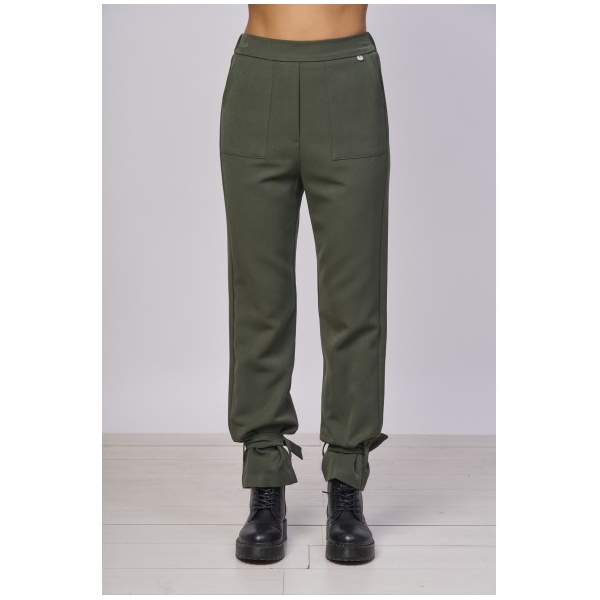 Pantalones confeccionados en suave tejido verde militar ideal con un suéter corto y botines con suela dentada para un look casual-chic y trendy.