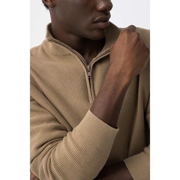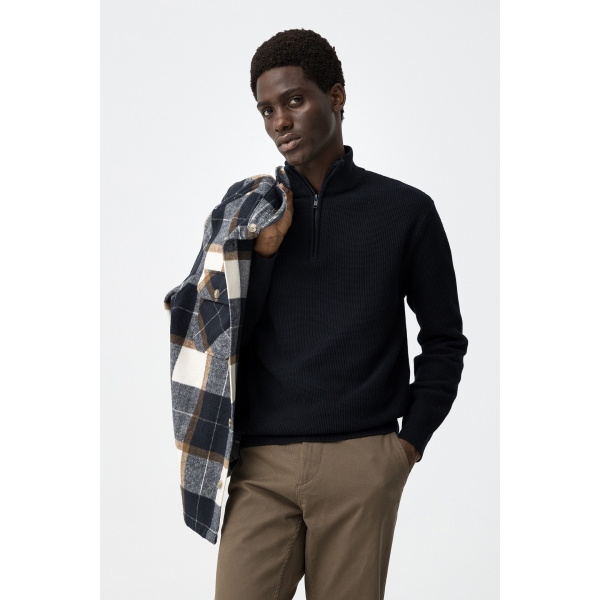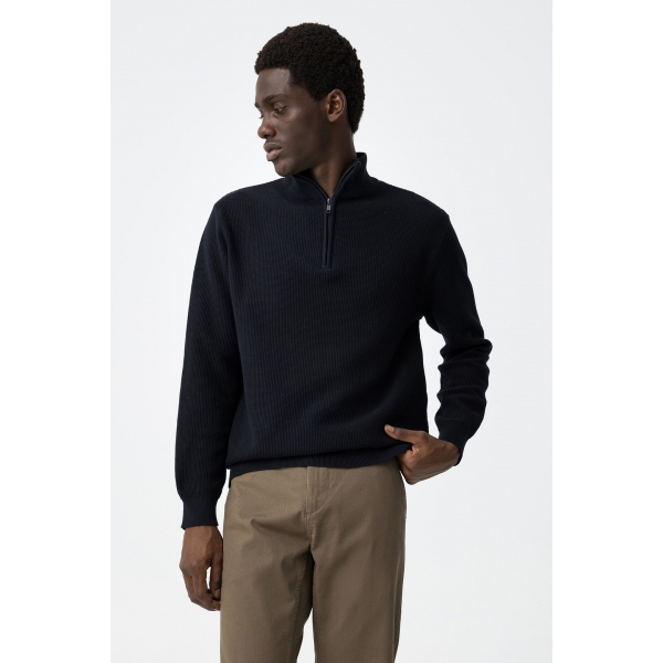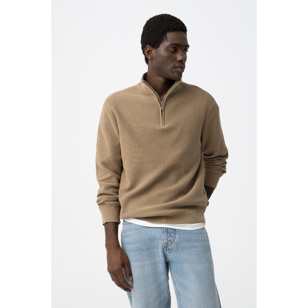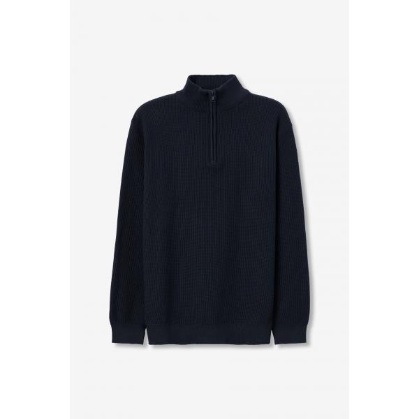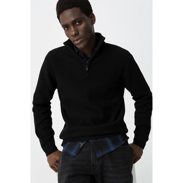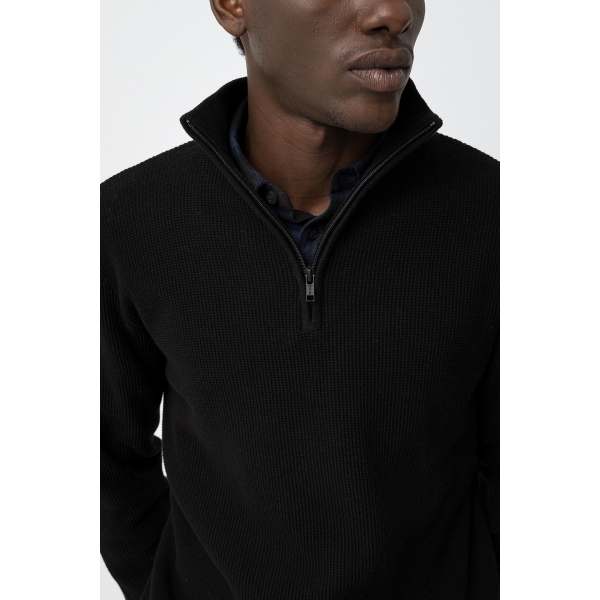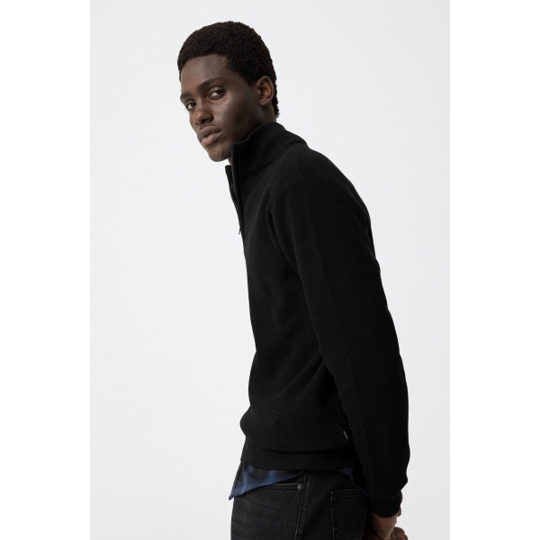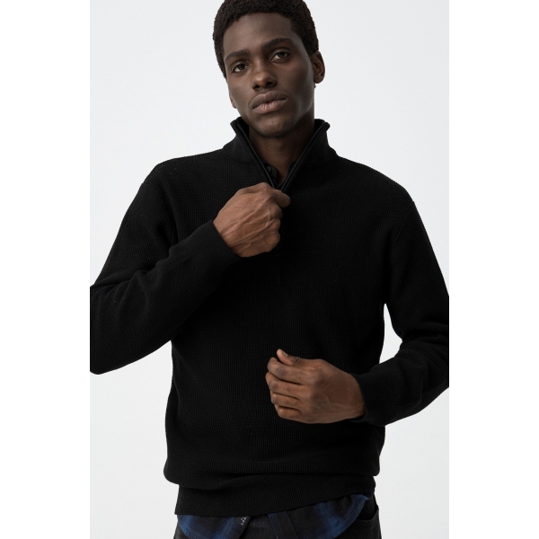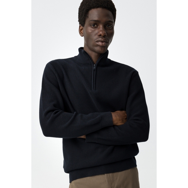 Jersey de manga larga en punto texturizado entrelazado, cuello alto con media cremallera metálica, puños y bajo en ribete (Foto).