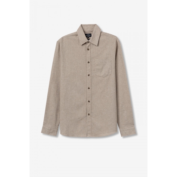 Camisa regular fit de algodón, con estampado chevron, bolsillo de parche delantero, cuello camisero, cierre de botones, manga larga con botones en los puños y bajo redondeado (Fotos).