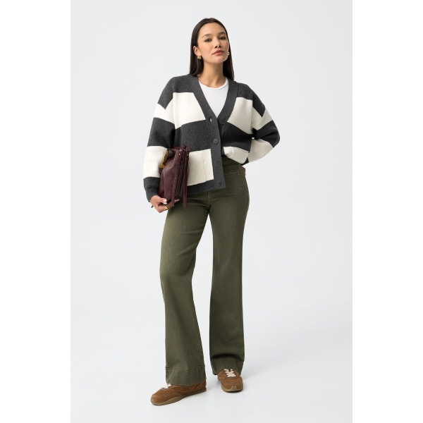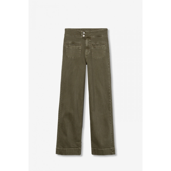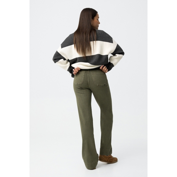 Vaqueros de corte recto en color verde oliva, con bolsillos traseros y cierre de botones (Foto).