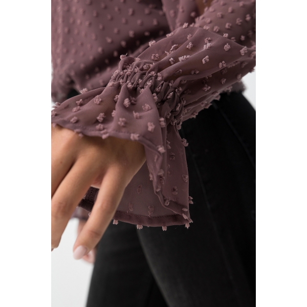 Blusa regular fit en tejido ligero transparente con textura plumeti en toda la prenda y mangas largas con acabado de volantes. Cuello redondo ligeramente fruncido y abertura trasera con botón (Foto).