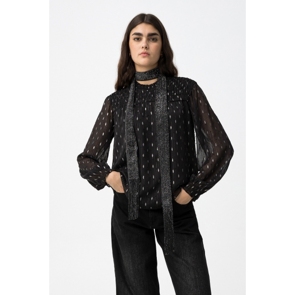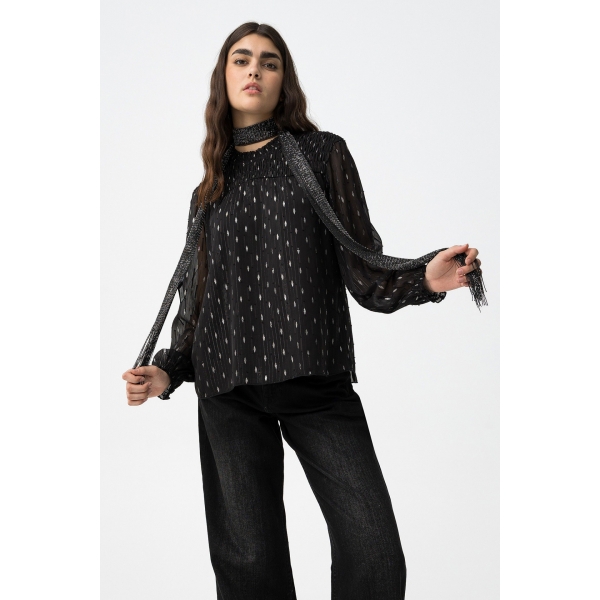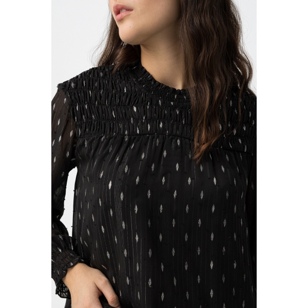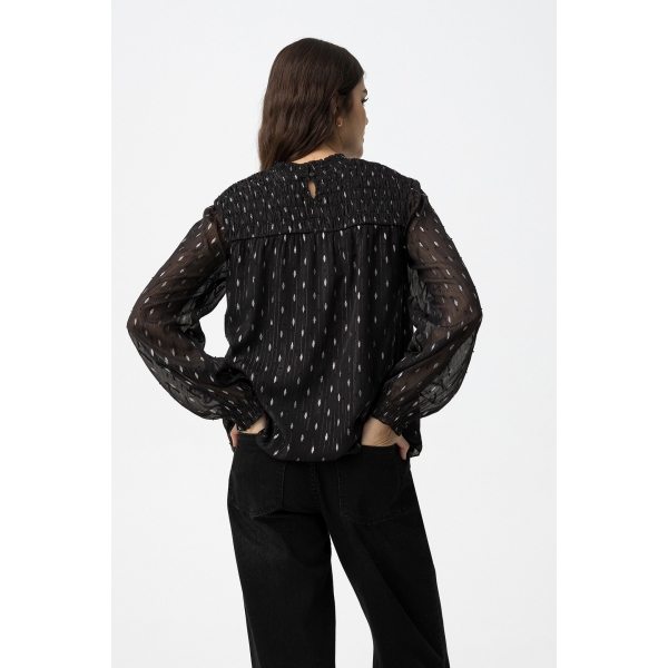 Blusa regular fit semitransparente con drapeado, textura, estampado metálico e hilo metálico insertado, cuello redondo con volante, manga larga con elástico y volante en los puños. Cierre de botón trasero (Foto).
