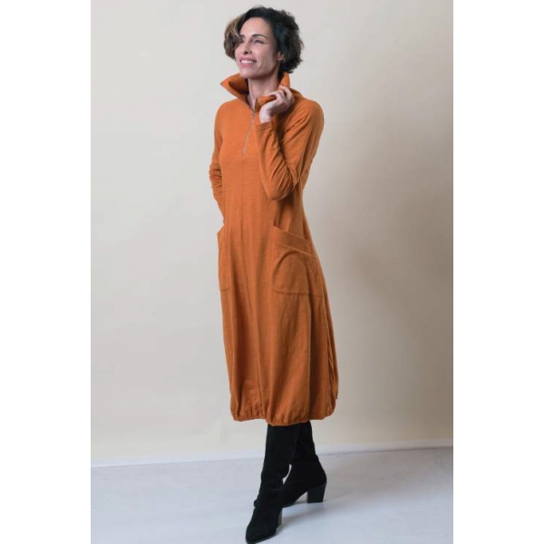 Vestido largo con bolsillos ECO, fabricada en España, manga larga y cuello de cierre en cremallera (Foto).