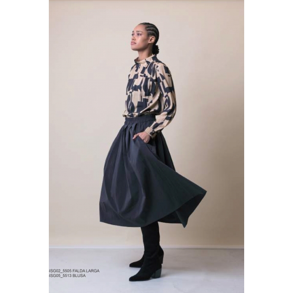 Blusa cuello redondo y puños abeja ECO, fabricada en España, con estampación en crudo y negro (Foto).
