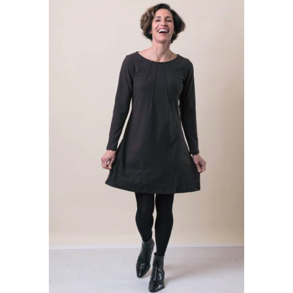 Vestido manga larga, cuello barca, acampanado, ECO, fabricado en España (Foto).