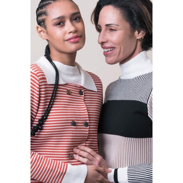 Chaqueta tricot corta con rayas teja y blancas ECO, fabricada en España, manga larga (Foto).