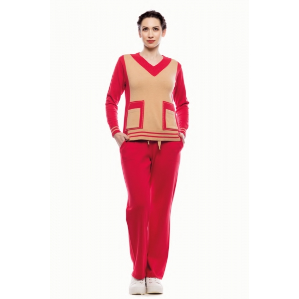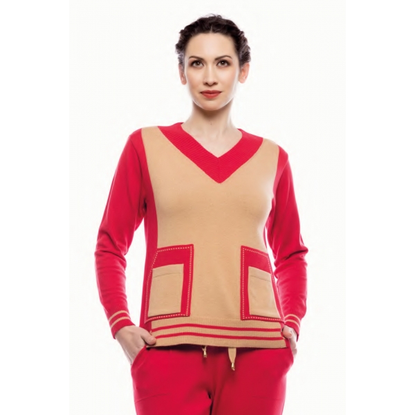 Jersey de punto, cuello pico, bicolor con bolsillos, divertido, diferente y fabricado en España. Combínalo con el pantalón Azahara (Foto).