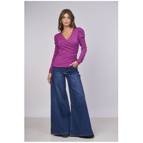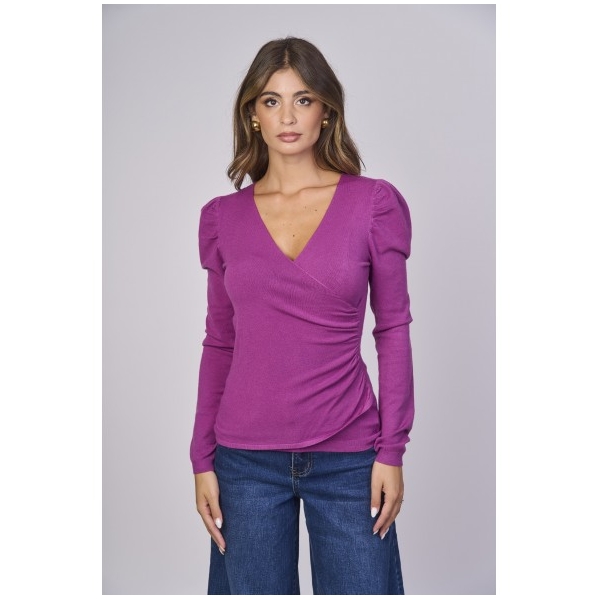 Jersey cruzado con escote en V, drapeado lateral y ajustado. Las mangas largas abullonadas en los hombros aportan un toque de volumen y modernidad (Foto)