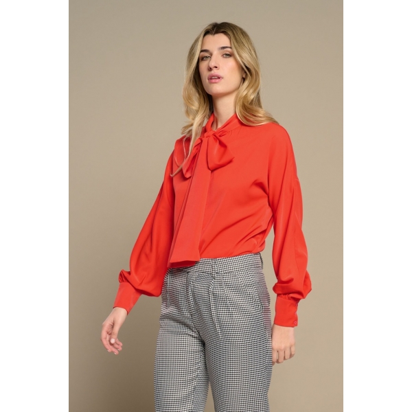 Blusa con lazada al cuello, manga larga con puños ajustados con botones, cómoda y fluida (Foto).