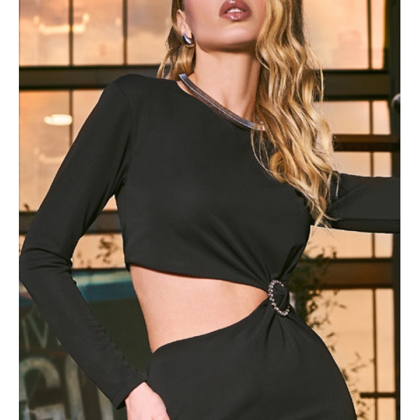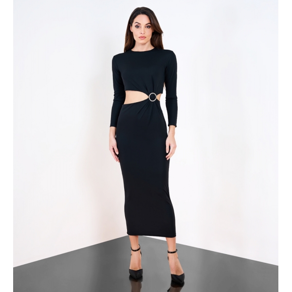 Vestido entallado de punto, corte largo, cuello redondo, manga larga y broche en cintura que aporta un toque moderno y sofisticado (Fotos).