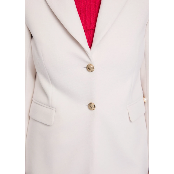 Abrigo en tejido de mezcla de viscosa elástica, cuello de solapa, bolsillos con solapa, charm con pedrería, cierre con botones dorados y forro interior(Fotos).