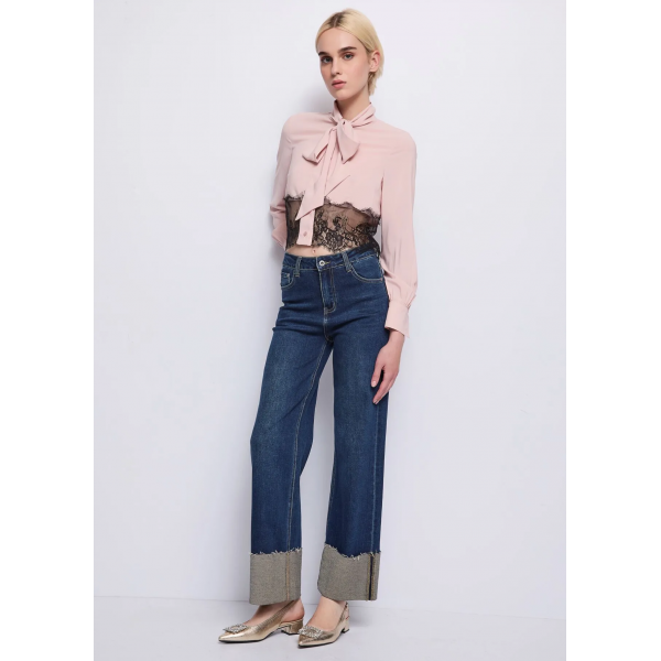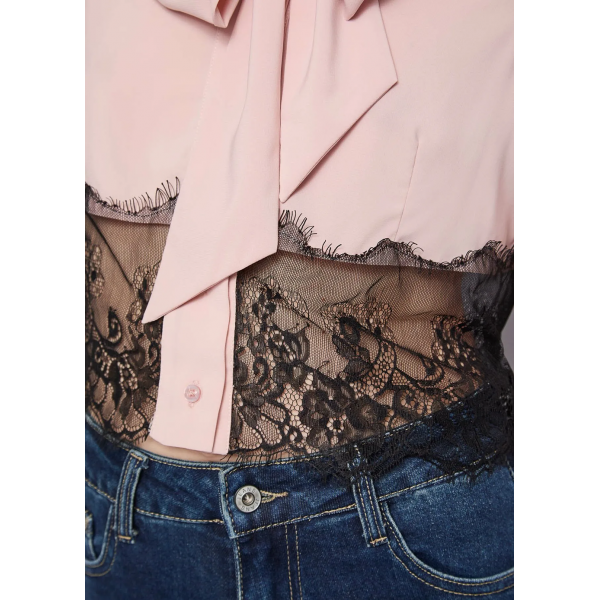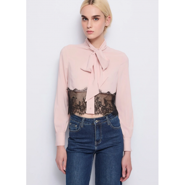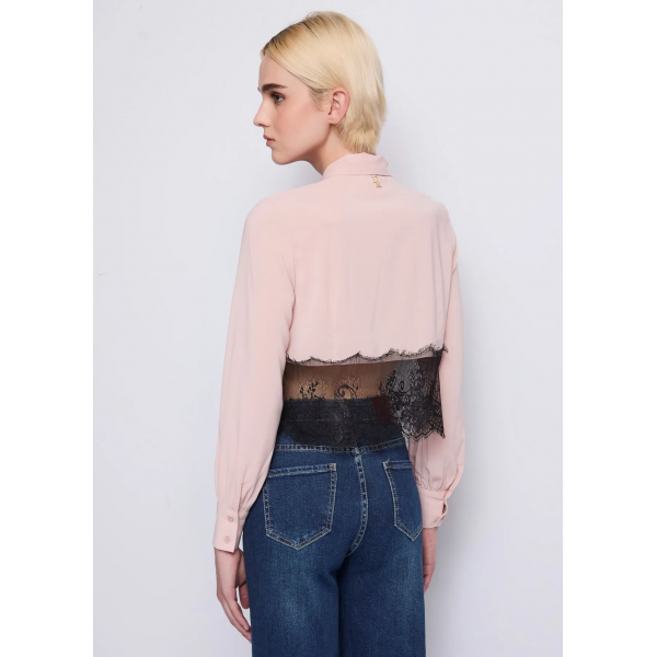 Camisa de georgette, inserción de encaje, cuello de bufanda, mangas largas, puños abotonados, logotipo de metal DR en la parte posterior y cierre de botones (Fotos).