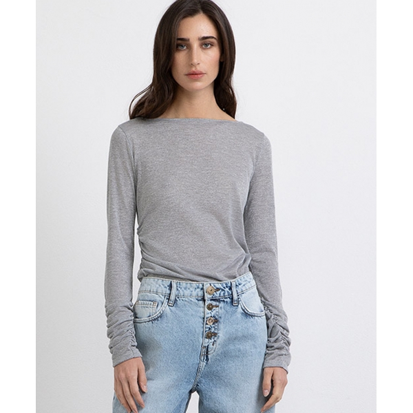 Jersey de punto Lurex de cuello barca y mangas largas. Con rizos en cintura y los laterales de las mangas (fotos).