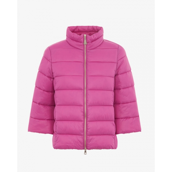 Plumífero corto y ligero de nailon brillante, cuello alto, mangas 3/4, bolsillos delanteros insertados, cierre frontal con cremallera de doble cursor, tirador con el logotipo y parche con el logotipo en la manga (fotos).