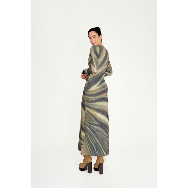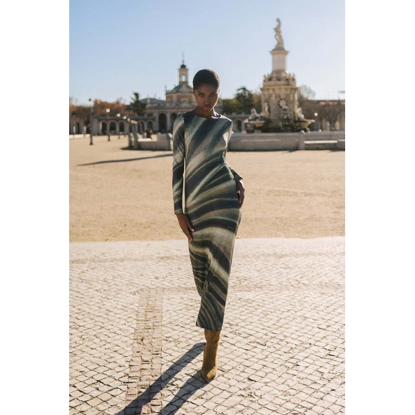 Vestido largo Malalá By Culito From Spain, cuello semi barca, manga larga con estampación verde (Foto).
