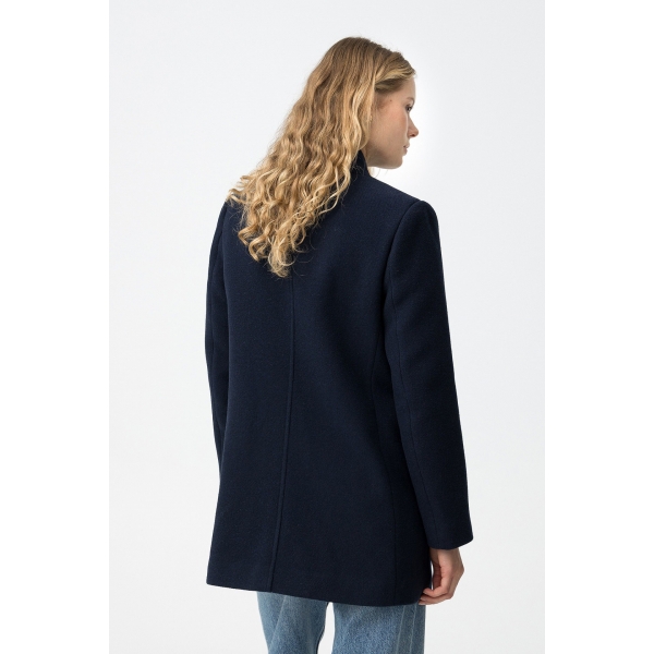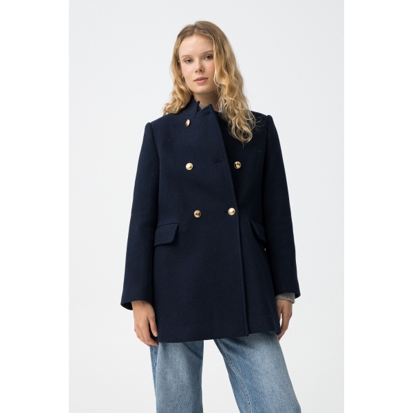 Abrigo slim fit con dos bolsillos con solapa, doble botonadura, botones metálicos, cuello alto y manga larga (Fotos).