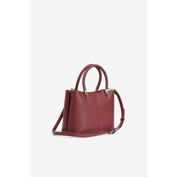 Bolso de color rojo con asas trenzadas, correa ajustable y cierre de cremallera metálica (Fotos).