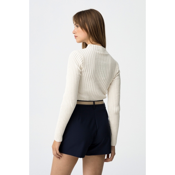Jersey ceñido al cuerpo en punto de canalé sin rematar, cuello alto, manga larga y bajo recto (Foto).