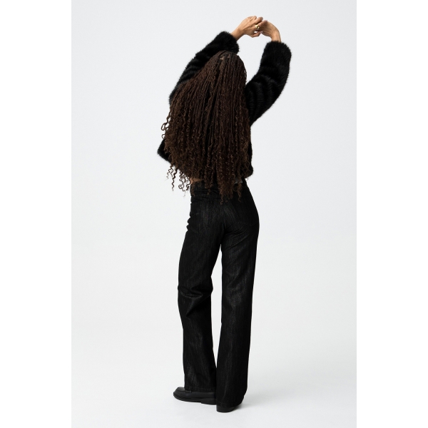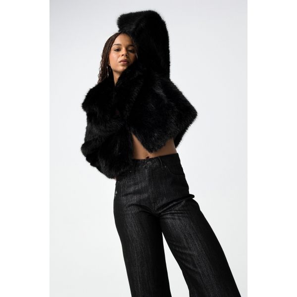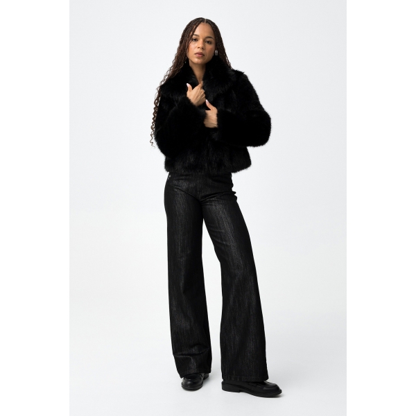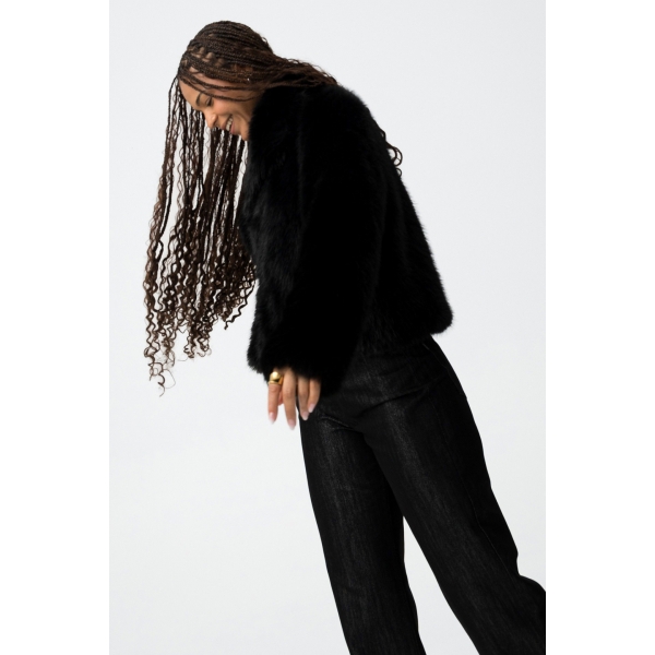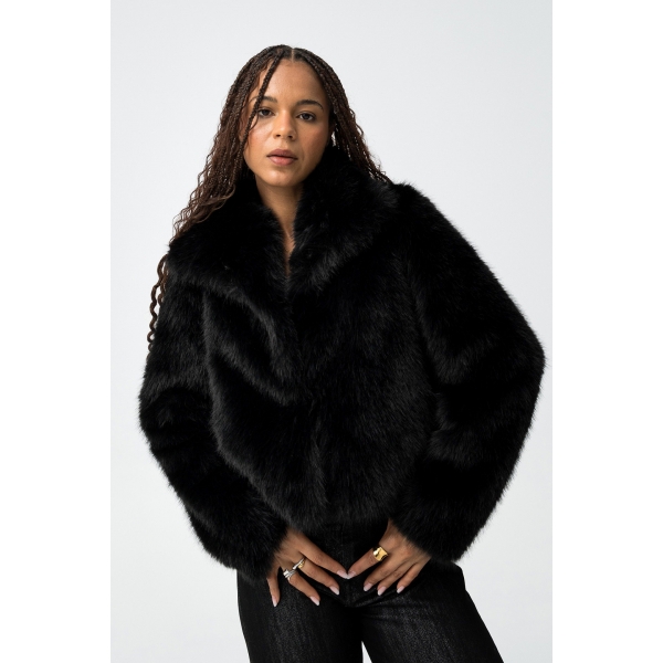 Chaqueta corta con cuello de solapa, manga larga, pelo sintético, bolsillos laterales y forro interior (Fotos).