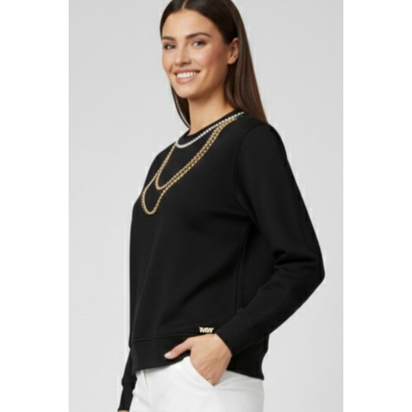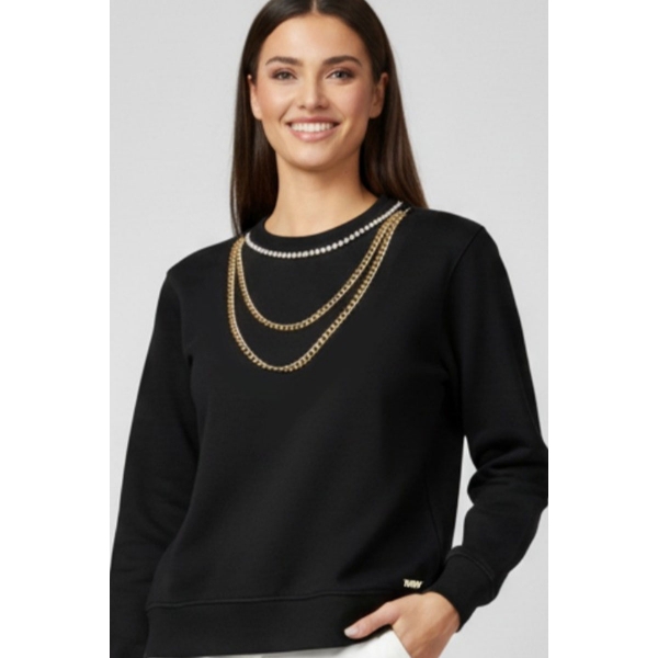 Sudadera de cuello redondo, en mezcla de algodón, detalle de apliques cadena y pedrería alrededor del cuello (Fotos).