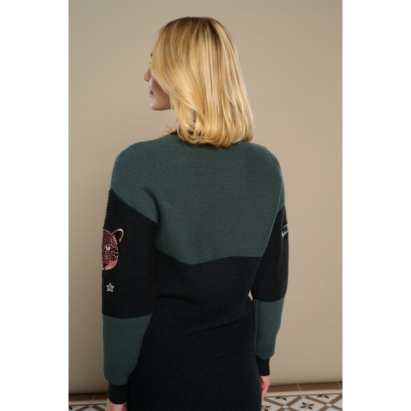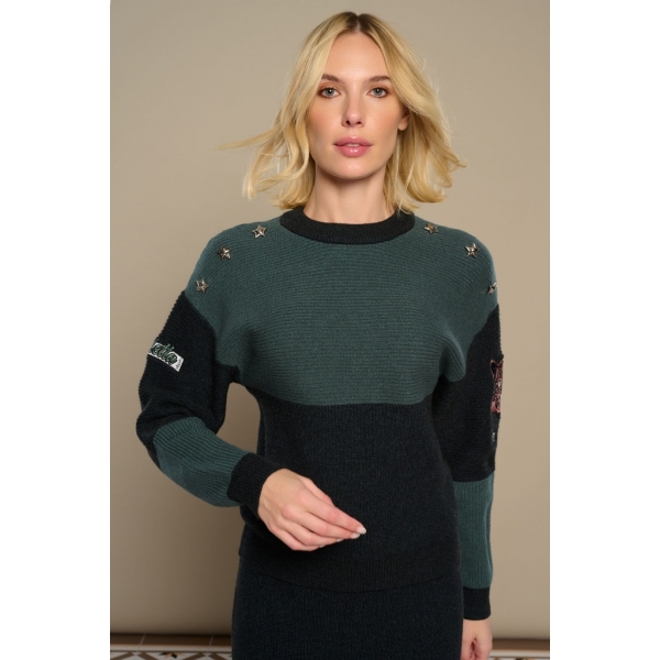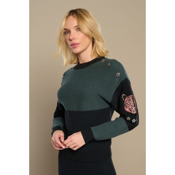 Jersey de punto elástico, cuello redondo y manga larga con ribete en cuello, puños y cintura. Detalle de tachuelas de estrellas en hombro y guepardo bordado en manga (Foto).