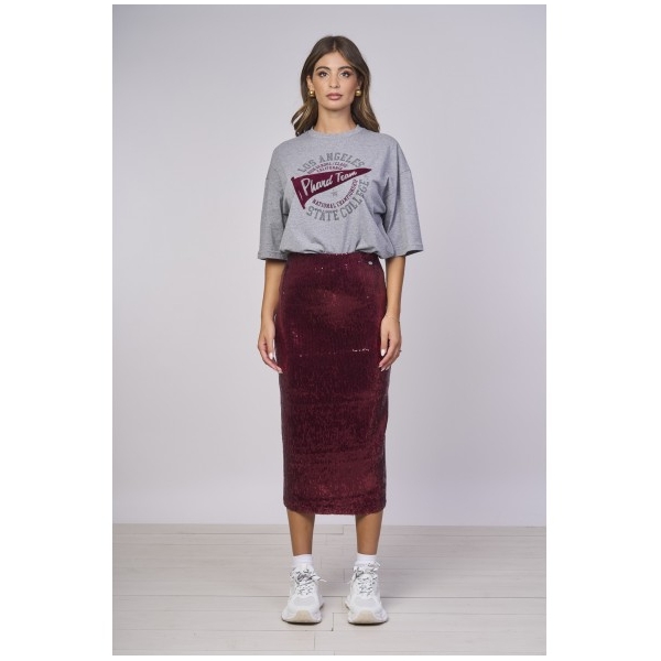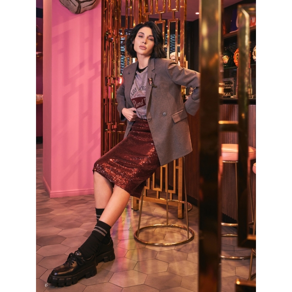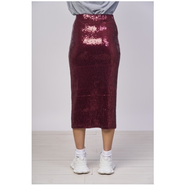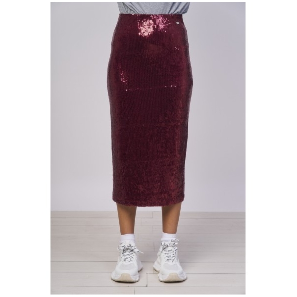 Falda tubo burdeos con lentejuelas, corte clásico y cómodo, la tela cubierta de lentejuelas brillantes aporta un toque de brillo y originalidad (Fotos).