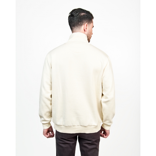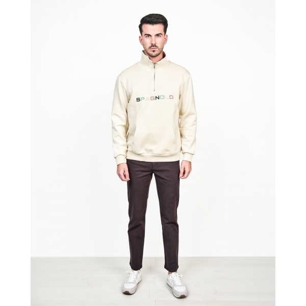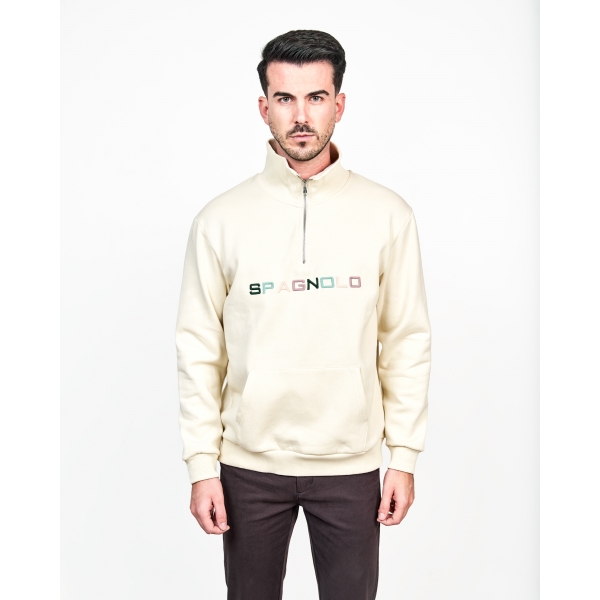 Sudadera de estilo casual, llamativo, comodo y cálido. Destaca por su cuello alto con media cremallera y el gran logo de la marca bordado en el pecho con letras de colores a contraste, lo que le confiere un aire juvenil y moderno.