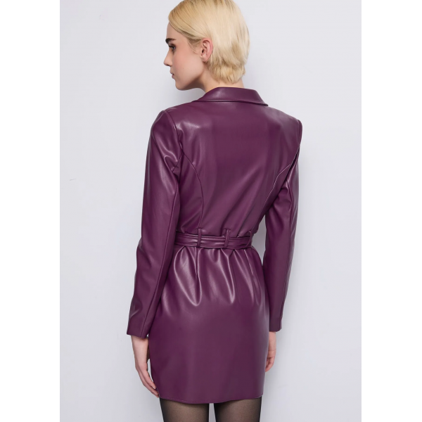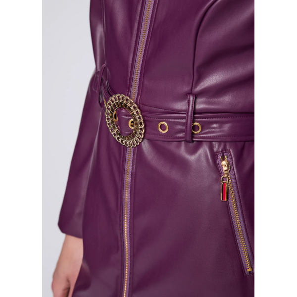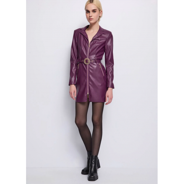 Minivestido de piel sintética, cuello de solapa, mangas largas, bolsillos con cremallera en los laterales, cinturón a juego con hebilla ajustable y dierre de cremallera con doble cursor (foto).