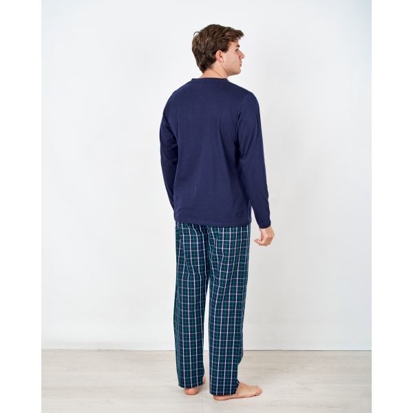 Pijama de algodón, conjunto de camiseta de manga larga azul marino de punto liso y un pantalón de cuadros de popelín a juego. Comodidad garantizada para tus noches.
