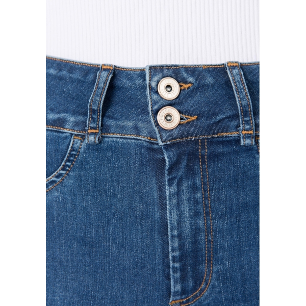 Jeans ajustados de tiro alto con tres bolsillos. Cierre frontal con cremallera y botones metálicos. Bolsillos falsos delanteros. Efecto push-up.