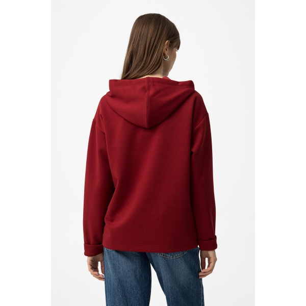 Sudadera roja con capucha, corte regular, mangas largas y cordones estampados en blanco y negro (Foto).