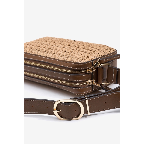 Bolso bandolera marrón con textura trenzada, cierre dorado y correa ajustable. Compacto y elegante (Foto).