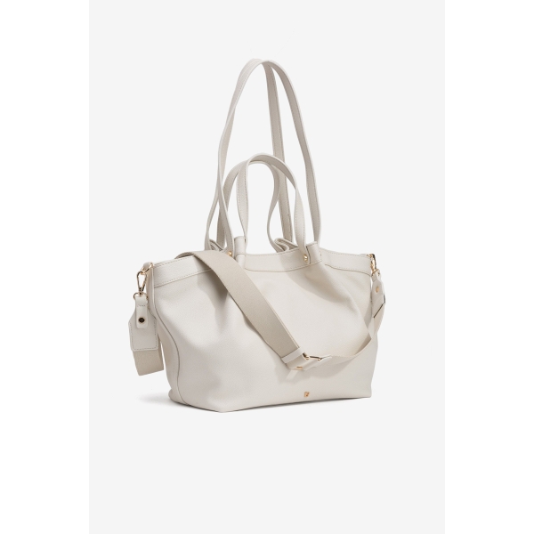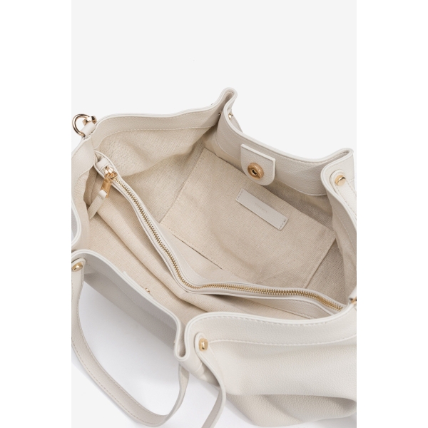 Bolso beige con asas dobles, cierre de cremallera, detalles dorados, diseño espacioso y elegante.(Foto).