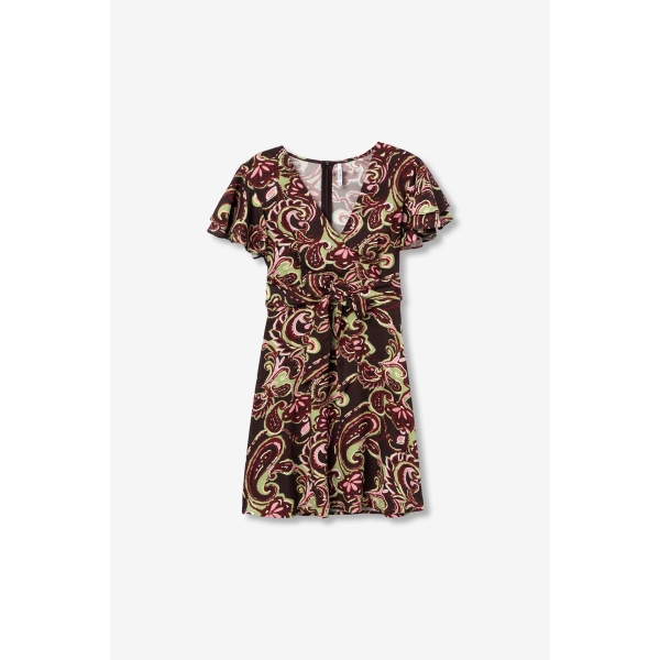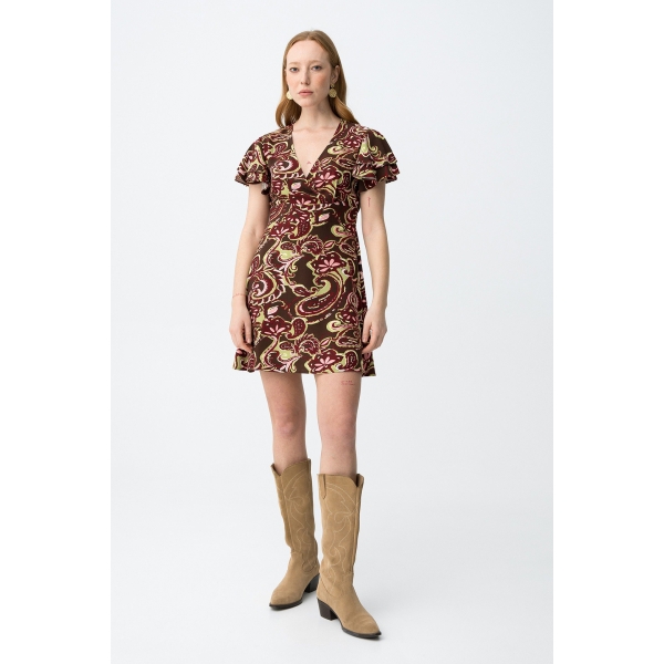 Vestido corto, manga corta, escote cruzado en V (Foto).