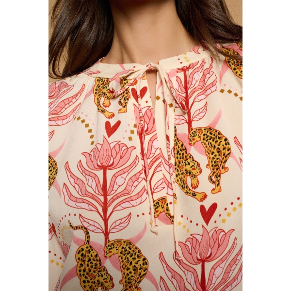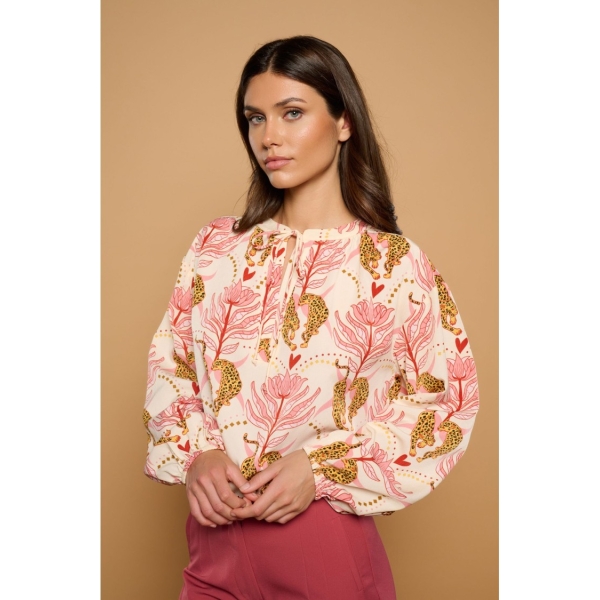 Blusa de cuello mao, manga larga abullonada, cierre con lazada en escote, tejido fluido y estampado leo boho (Foto).
