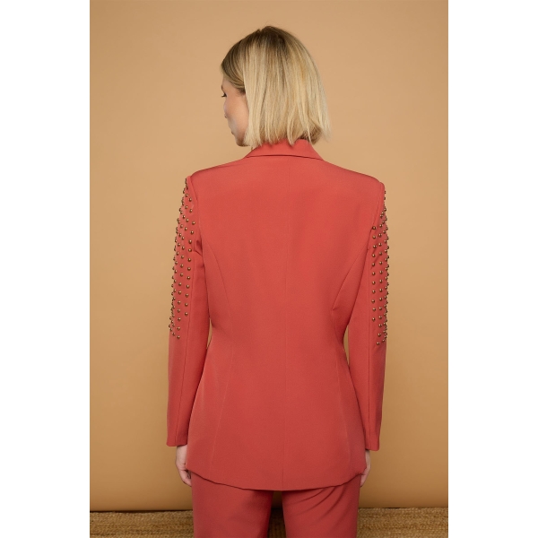 Chaqueta americana en coral, cuello solapa, manga larga con hombreras, detalle de alas bordadas en hilo dorado, estrellas sobre las solapas, detalle de tachuelas esféricas doradas en hombros y laterales. Cierre frontal de doble botonadura con botones metálicos dorados (Foto).