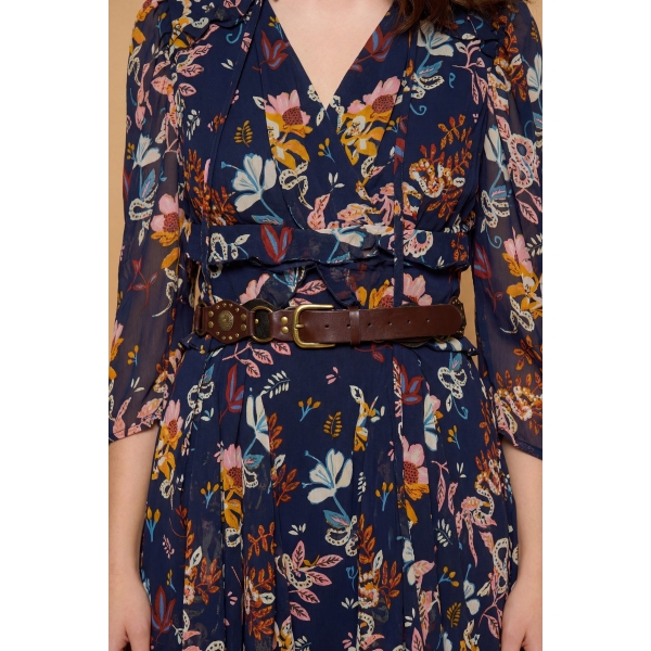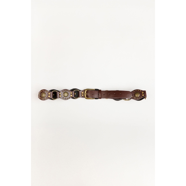 Cinturón con hebilla metálica, detalle de piezas unidas por anillas metálicas con tachuelas y apliques circulares. Color marrón (Fotos).