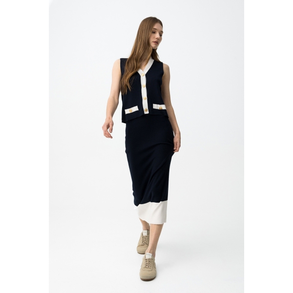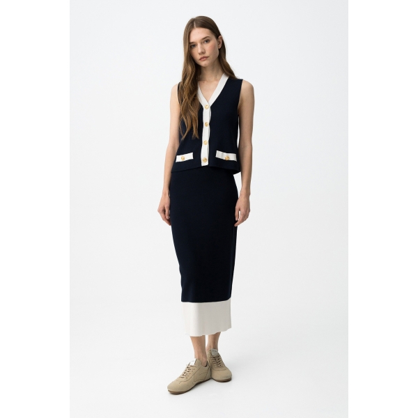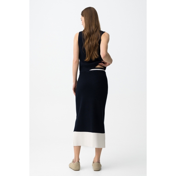 Falda azul oscuro corte recto, largo midi, bajo en blanco y cintura regular, estilo minimalista (Foto).