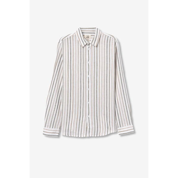 Camisa a rayas verticales, cierre de botones, cuello clásico y mangas largas abotonadas (Fotos).