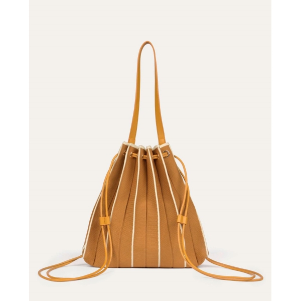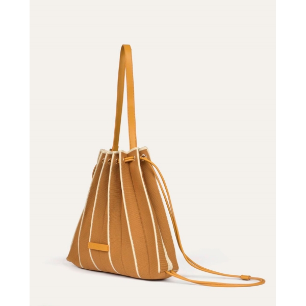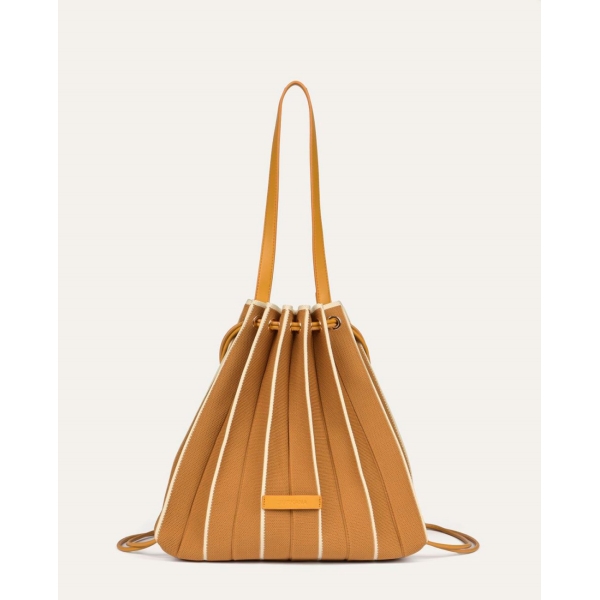 Bolso/Mochila de diseño triangular confeccionado en punto con textura plisada, cierre mediante cordones ajustables con ojales metálicos. Incluye neceser interior extraíble a tono (Foto).