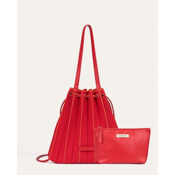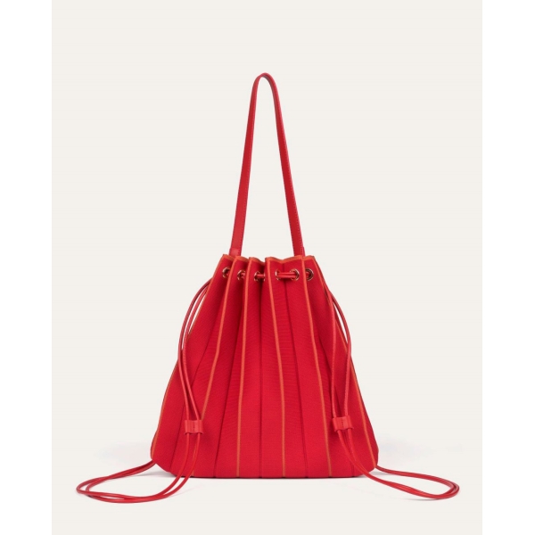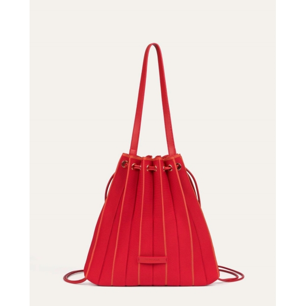 Bolso/Mochila de diseño triangular confeccionado en punto con textura plisada, cierre mediante cordones ajustables con ojales metálicos. Incluye neceser interior extraíble a tono (Foto).