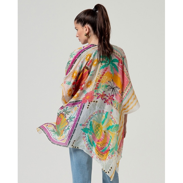 Kaftan abierto de escote en pico y manga amplia. Diseño sin cierre de silueta fluida y largo asimétrico. Presenta estampado integral en tonos amarillos y acabado ligero. Kaftan de playa estampado (Foto).