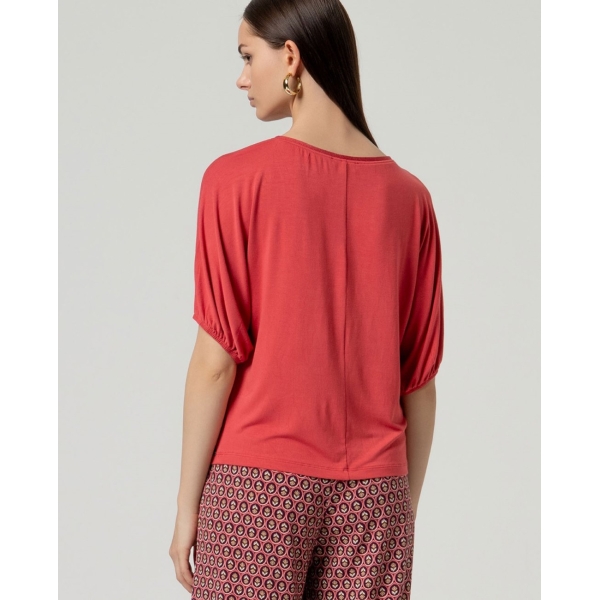 Camiseta de cuello barco y manga corta de tipo murciélago acabada en puño elástico. Diseño de silueta amplia con costura vertical central en la espalda y bajo recto a la cadera. Confeccionada en tejido de viscosa de bambú y elastano de tacto suave (Foto).